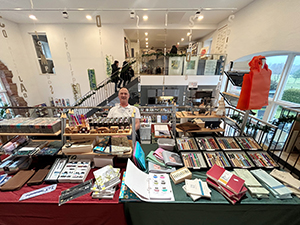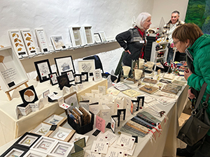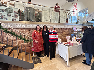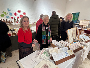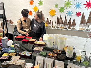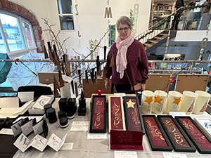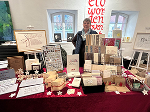 12.12.24 Am 7. Dezember, dem 2. Adventssamstag, fand unser diesjähriger Weihnachtsmarkt statt. Trotz des widrigen Wetters kamen viele Besucher zum weihnachtlich geschmückten Gut Königsbruch, um die schöne Stimmung bei uns und am gesamten Hofgut zu genießen. Unsere Aussteller hatten alle ein breites Angebot, das auf großen Zuspruch traf. Im Eingangsbereich stellten die Stiftung Schriftkultur und Katharina Pieper aus, in der Galerie Sascha Boßlet mit wunderschönen Papieren und Schreib- und Buchbindebedarf, Michaela Rayer mit handgeflochtenen Tannenbäumen, Papiersternen und weiteren zauberhaften Objekten und Helga Freyer mit viel Bewährtem und Originellem. Regina Seiler zeigte ein breites Angebot rund um kalligrafische Objekte, Sigrid Goldschmidt aus Aachen stellte ihre Radierungen, Zeichnungen und Kalligrafien aus, Volker Köhl präsentierte wie immer seine handgefertigten Schreibobjekte und hatte viel Neues dabei, und Ute Müller-Eisenlohr bot Buchobjekte, Weihnachtssterne aus Papier und viele weitere Kostbarkeiten an. In der Bibliothek hatte Bernd Detsch (Art Book Saar) seinen großen Stand mit Büchern und vielen Kunstbuchraritäten, und Susanne Schmidt präsentierte ihre schönen Patchworkarbeiten mit den beliebten Federmäppchen. Auch das neue Jahrbuch 2024 stand in Umschlägen für unsere Mitglieder bereit. Alle, sowohl die Besucher als auch die Aussteller und fleißigen Helferinnen Karin, Sibylle, Eveline, Gisela und Christine freuten sich über einen gelungenen Weihnachtsmarkt! (Fotos: S. Becker, K. Fischer, K. Pieper) |