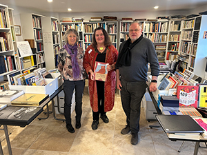 03.09.2023 Unser Bücherflohmarkt am gestrigen Samstag wurde gut besucht. Mitglieder kamen teils von weit her, um sich einige der besonderen Raritäten oder Schnäppchen zu sichern. Aus Mainz, St. Augustin und sogar aus der Schweiz reisten unsere kalligrafischen Freundinnen und Freunde an – die Freude des Wiedersehens war groß. Zahlreiche Bücher aus dem Nachlass von Heiner Müller wechselten den Besitzer oder die Besitzerin. Darunter befanden sich auch Schätze, die signiert waren, die nicht mehr zu bekommen oder die mit handschriftlichen Signaturen versehen sind. So manch wertvolles Buch konnte für wenig Geld erstanden werden. Bücher aus dem Nachlass von Jean Larcher und der Bibliothek von Katharina Pieper wurden ebenso angeboten wie Bücher, die uns einige Mitglieder aus ihrem Fundus zur Verfügung gestellt haben. Bert, der Mann unseres Mitglieds Silvia aus St. Augustin, hatte eine Gitarre über der Schulter, und auf Bitten hin spielte er für uns im "Hintergrund" dezente selbstkomponierte Musik. Familienhund Luna bewachte Assistentin Karin und die Kasse. Herzlichen Dank an alle, die zum Gelingen des Bücherflohmarktes beigetragen haben! |