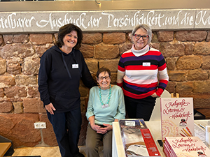 06.10.2025 Am gestrigen Tag der Kalligrafie führten Katharina Pieper, Brigitte Jenner, Michaela Rayer, Ilse Spies und Volker Köhl Kalligrafisches und Handwerkliches rund um die Schöne Schrift vor. Zahlreiche interessierte Besucher stellten Fragen und schauten uns über die Schulter. Es ergaben sich gute Gespräche und Kontakte. Namen in englischer Schreibschrift wurden geschrieben, Blätter in Bastarda vorgeführt. Karten und Lesezeichen hergestellt, zahlreiche Federtypen und Techniken des Schreibens gezeigt, Embossings erstellt, Namen auf Schreibwerkzeuge graviert und viele kalligrafische Werke gezeigt. Judith aus Saarbrücken und Irina aus Ingelheim, zwei begeisterte Mitglieder der Stiftung Schriftkultur, halfen beim Zählen der Besucher und warben mit viel Charme für unsere Bücher, Kataloge und die Kalligrafie. Schön war's! |