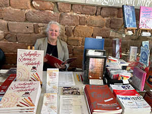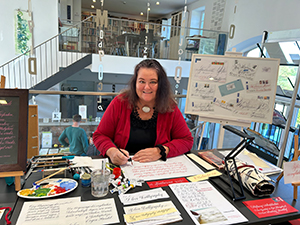 17.07.22 Auf dem Kultstadtfest in Saarbrücken präsentierte sich die Stiftung Schriftkultur am 16. Juli mit viel Kalligrafischem im Historischen Museum am Schlossplatz. Brigitte Jenner, Ilse Spies und Katharina Pieper bekamen den (wohltemperierten) Eingangsbereich des Museum zur Verfügung gestellt. Vorführungen zu verschiedenen Schriften, viele Gespräche und ein reichhaltiges Angebot an Karten, Büchern, Lesezeichen und kalligrafischen Originalen brachten die Schriftkultur einem interessierten Publikum nahe. Die Organisation des Kultstadtfestes sowie der Leiter und die Mitarbeiterinnen und Mitarbeiter des Historischen Museums unterstützten uns sehr – herzlichen Dank! |