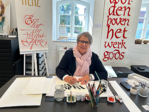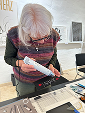 06.05.2025 Am ersten Sonntag im Mai fand wieder ein Tag der Kalligrafie in unserer Galerie statt. Viele interessierte Besucher von nah und fern kamen zu uns, um sich über unsere Aktivitäten zu erkundigen. Viele, die zum ersten Mal da waren, waren – wie immer – beeindruckt, auch von den großzügigen Räumen der Stiftung Schriftkultur und vom gesamten Anwesen Gut Königsbruch. Inmitten der derzeit laufenden Ausstellung "Hommage an Jean Larcher" führte Katharina Pieper verschiedene Schriften vor, und wer wollte, konnte sich nicht nur ein Lesezeichen mit dem eigenen Namen schreiben lassen, sondern auch Glasfedern, handgefertigte Bambusfedern oder Bierdosenfedern erwerben. Brigitte Jenner und Ilse Spies zeigten diverse kalligrafische Techniken auf edlen Papieren und boten schöne handgeschriebene Karten, Leporellos, Büchlein und vieles mehr zum Verkauf an. Volker Köhl gravierte Namen oder andere Schriftzüge auf verschiedene Schreibgeräte oder weitere praktische Utensilien. Auch die Kinder freuten sich über seine humorvolle Art und lernten manches technische Fachwissen. Es war ein voller Tag mit vielen guten Gesprächen, und bei dem ein oder anderen wurde das Interesse für weitere Besuche geweckt. |