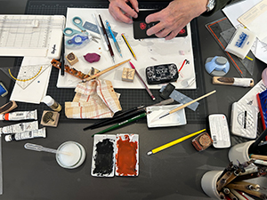 29.02.2024 Im Kurs „Freie Heftungen und japanische Buchbindetechniken“ mit Sascha Boßlet am vergangenen Wochenende wurde eifrig gearbeitet. Sascha erklärte viel Praktisches und zeigte anhand von zahlreichen Beispielen originelle und einfach zu lernende Buchbindetechniken. Mit viel Energie, fundiertem Hintergrundwissen und einem fast unerschöpflichen Fundus an Materialien und Papieren leitete Sascha die Teilnehmerinnen an, wunderschöne Buchobjekte herzustellen. Auch Leder und sogar Kuhfelle kamen zum Einsatz. Ein alter Schneidehobel von Katharina Pieper wurde demonstriert und auf seine Tauglichkeit geprüft. Es war ein intensives Wochenende, das nicht nur von der buchbinderischen Arbeit, sondern auch von guter Laune und kulinarischen Köstlichkeiten geprägt war! |