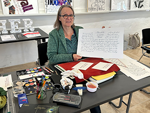 06.10.2025 Am gestrigen Tag der Kalligrafie führten Katharina Pieper, Brigitte Jenner, Michaela Rayer, Ilse Spies und Volker Köhl Kalligrafisches und Handwerkliches rund um die Schöne Schrift vor. Zahlreiche interessierte Besucher stellten Fragen und schauten uns über die Schulter. Es ergaben sich gute Gespräche und Kontakte. Namen in englischer Schreibschrift wurden geschrieben, Blätter in Bastarda vorgeführt. Karten und Lesezeichen hergestellt, zahlreiche Federtypen und Techniken des Schreibens gezeigt, Embossings erstellt, Namen auf Schreibwerkzeuge graviert und viele kalligrafische Werke gezeigt. Judith aus Saarbrücken und Irina aus Ingelheim, zwei begeisterte Mitglieder der Stiftung Schriftkultur, halfen beim Zählen der Besucher und warben mit viel Charme für unsere Bücher, Kataloge und die Kalligrafie. Schön war's! |