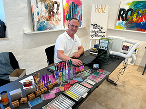 29.08.22 Am vergangenen Samstag fand in Homburg auf dem historischen Marktplatz und in der Fußgängerzone nach der langen Corona-Pause zum ersten Mal wieder die ARTmosphäre statt, ein Freiluftmarkt für Künstler und Kunsthandwerker. Der syrische Schriftkünstler Ayham Najjar, der in der Stiftung Schriftkultur bereits mehrfach ausstellte und Kurse leitete, repräsentierte seine Kunst und die Stiftung Schriftkultur am Anfang der Fußgängerzone inmitten der bunten und vielseitigen Stände. Ein Dank an alle Organisatorinnen und Organisatoren der Stadt Homburg! (Foto links: Sr.de) |