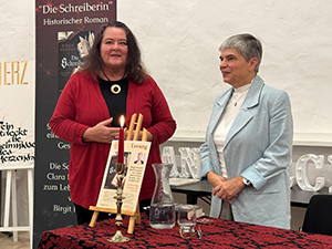 10.10.2025 Das Buch "Die Schreiberin" mit dem Untertitel "Federn, Tinte, geheime Lettern – eine Frau schreibt Geschichte" von Birgit Herold wurde am gestrigen Abend einer großem Gruppe interessierter Zuhörer von der Autorin vorgestellt und im stimmungsvollen Ambiente präsentiert. Frau Herold und ihr Mann brachten zahlreiche Utensilien mit, die den Inhalt des Buches passend illustriert haben: Kerzen, Gänsekielfedern und Eisengallustinte, die aus Galläpfeln hergestellt wird, Bücher, die das Leben im Mittelalter beschrieben und weitere authentische Gegenstände. Gespannt lauschten die Anwesenden Frau Herold beim Lesen einiger Auszüge aus ihrem Buch zu und stellten zahlreiche Fragen. Das Leben der Schreiberin Clara Hetzlerin, die im 15. Jahrhundert in Augsburg gelebt hat, wurde an diesem Abend und im Buch von Birgit Herold aufs Treffendste zum Leben erweckt. Eine spannende Empfehlung! Birgit Herold hat auf ihrer Instagram-Seite auch einen wunderbaren Bericht gepostet: https://www.instagram.com/p/DPnu35tDNHr/?img_index=1 |