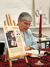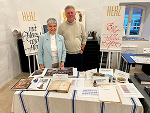 01.05.2023 Gestern am "Tag der Kalligrafie" besuchten uns viele Interessierte am künstlerischen Schreiben, um uns über die Schulter zu schauen und Neues zu sehen – den Tanz auf dem Papier! Brigitte Jenner präsentierte kleine und feine Original-Leporellos und Karten und zeigte den Besuchern das Schreiben verschiedener Schriften mit Gouache. Ilse Spies erklärte verschiedene Techniken, die Unziale und andere Schriften zu schreiben, erläuterte fachgerecht die Unterschiede und weckte Begeisterung bei den Besuchern. Volker Köhl (Pen Paradise) hatte wieder viele neue Schreibgeräte, Füller und Federhalter im Angebot, aber auch feine Papiere, Briefumschläge, Schreibblöcke und mehr. Katharina Pieper zeigte das Schreiben verschiedener Schriften und erklärte vieles zu Federn, Tinten und anderen kalligrafisch-künstlerischen Techniken. Alle freuten sich über die gelungene Veranstaltung! (Fotos: Wilfried Köhn) |