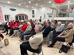 11.02.2024 Links: ein Abend im offenen Atelier: alle Teilnehmerinnen haben Freude beim Schreiben und Gestalten der Fraktur. Besonders schöne Ergebnisse beim letzten Mal lassen alle einschließlich Dozentin strahlen! – Mitte: Der neue Rundbrief Nr. 14 wurde soeben von Katharina Pieper an 140 Mitglieder verschickt. Jedes Mitglied bekam seine Initialen in Fraktur auf den Umschlag geschrieben. Viel Handarbeit, einschießlich des Aufklebens der Briefmarken. Rechts: Hoher Besuch beehrte uns vor einigen Tagen. Der buddhistische Lama Konchog Samten aus Ladakh kam zusammen mit Irene Özbek, Anne und Klaus Hessenauer und dem Ehepaar Zimmer. Er leitet ein Kloster im Gebirge von Ladakh und ist spiritueller Führer einer Gemeinde in Deutschland. Nicht zuletzt haben wir über ein zukünftiges Projekt gesprochen! |